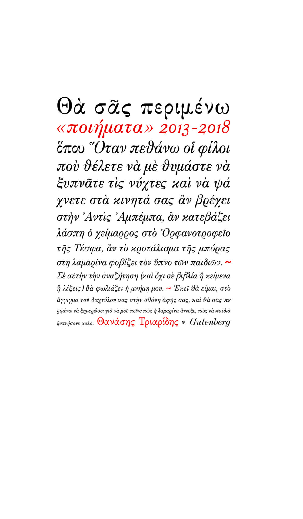 Μια ποιητική ιστορία σαράντα ετών. Μια αφηγηματική σύνθεση με αδημοσίευτα, αλλά και δημοσιευμένα ποιήματα σε νέα γραφή, ενωμένα ή διαλυμένα, μέσα στη νέα μορφή. Οι τίτλοι έχουν την ιστορία τους, τα ποιήματα μιαν άλλη, οι ενότητες, η φωνή, η σιωπή, η σκηνή, οι πρόβες, η αυλαία που ανοίγει και κλείνει, ο χρόνος που τα διατρέχει, η ιστορία του, ο Λόγος? και εντέλει η ποίηση.